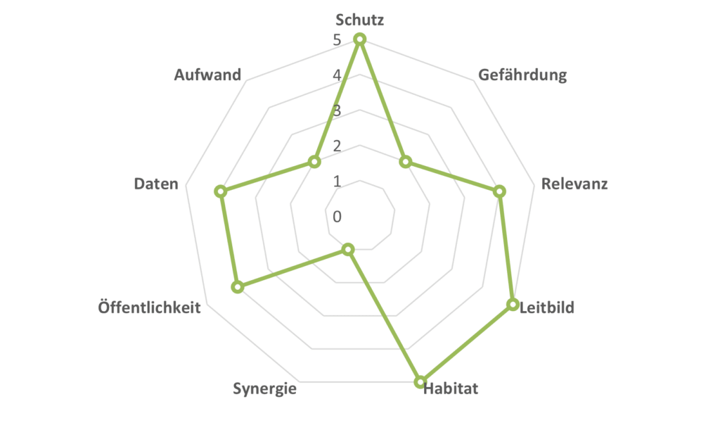 - Leitbildkonformität: Charakterart des Großlebensraumes „Fels, Schutt, Gebirge“, welcher im Leitbild des Naturparks Karwendel die höchste Priorität hat (5 Punkte)