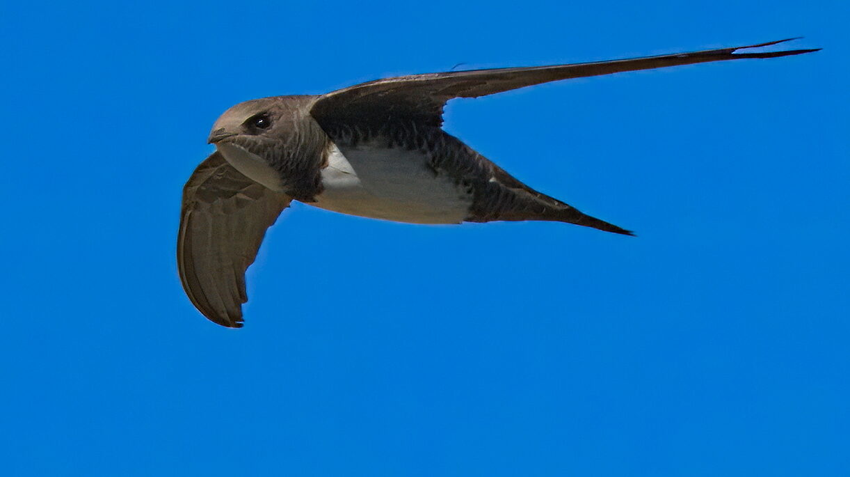 Zumeist lässt sich der Alpensegler gleitend durch die Lüfte entdecken. Sein weißer Bauch und seine weiße Kehle machen die Bestimmung möglich. Kein Wunder, dass der Gattungsname „Apus“ „ohne Füße“ bedeutet – zwar haben die Segler Füße, aber diese brauchen sie kaum, da sie den Großteil ihres Lebens in der Luft verbringen.
