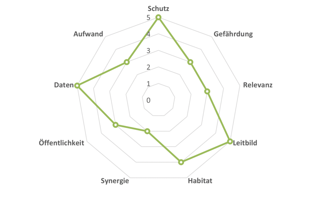 - Synergie: Insbesondere von den Besucherlenkungsmaßnahmen würden nur wenige andere Arten direkt profitieren (2 Punkte)