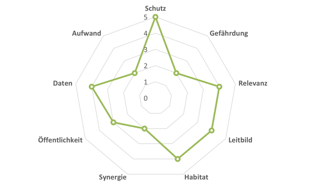 - Leitbildkonformität: Die Art lebt in extensiv genutzten Wäldern, welche im Leitbild des Naturparks Karwendel die zweithöchste Priorität haben (4 Punkte)