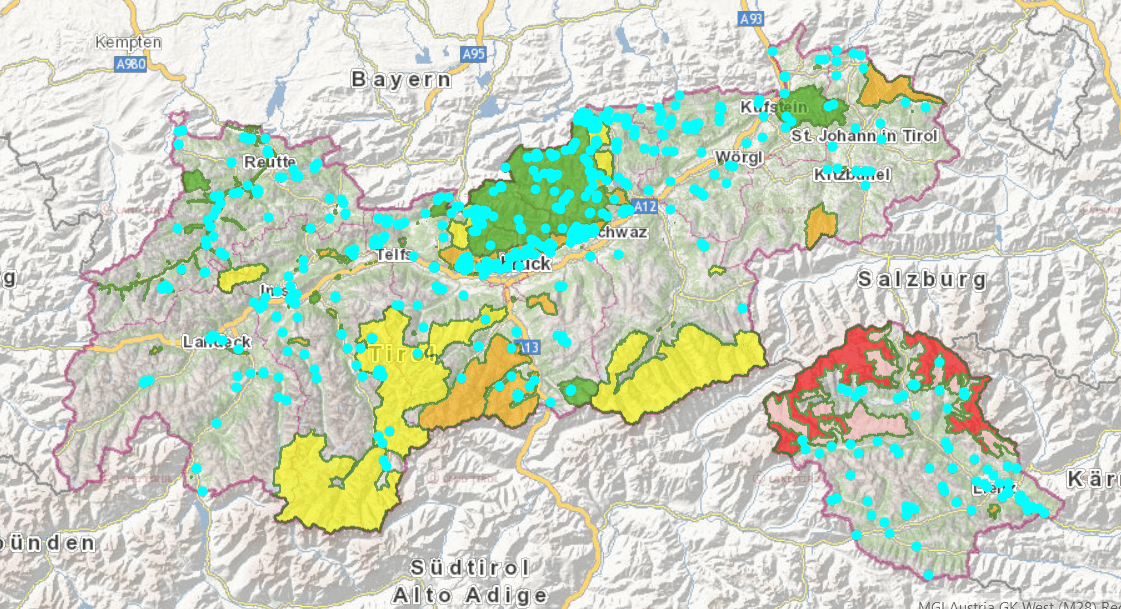 - Datengrundlage: Mehrjährige, ornithologische Grundlagenerhebung zu den Vögeln im Natura2000- und Vogelschutzgebiet Karwendel (4 Punkte)