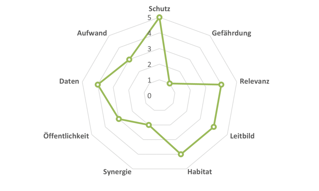 - Synergie: Durch Artenschutzmaßnahmen ergeben sich nur wenige positive Effekte auf weitere Arten der Auswahlliste. Profitieren würden zum Beispiel das Haselhuhn, das Auerhuhn oder der Waldkauz (2 Punkte)
