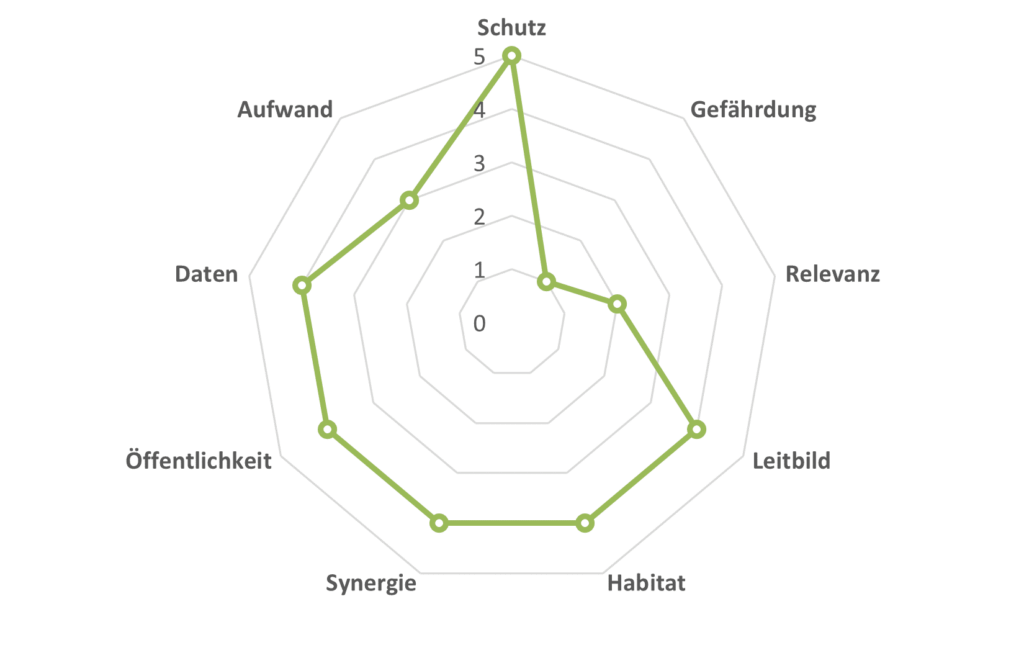 - Leitbildkonformität: Die Art lebt in extensiv genutzten Wäldern, welche im Leitbild des Naturparks Karwendel die zweithöchste Priorität haben (4 Punkte)