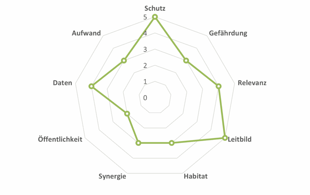 - Synergie: Artenschutzmaßnahmen würden auch positive Effekte für 11-15 Arten der Auswahlliste u.a. für die Deutsche Tamariske, den Kiesbank-Grashüpfer, Türks Dornschrecke, die Koppe und den Flussuferläufer mit sich ziehen (3 Punkte)