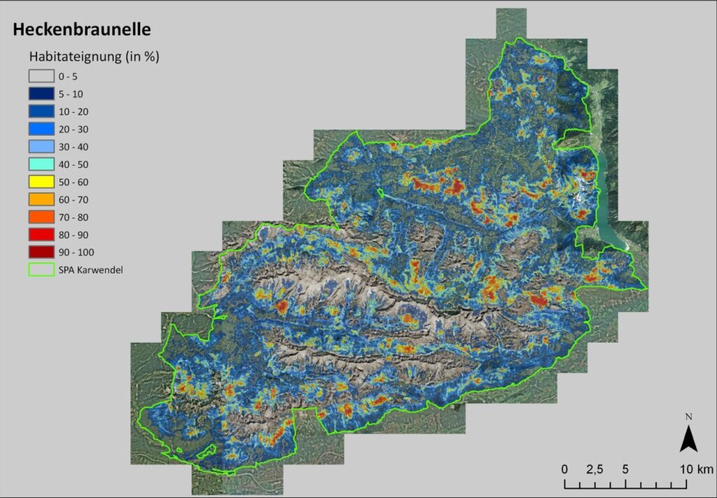 Die Heckenbraunelle bewohnt im Karwendel vorzugsweise mosaikartig aufgelockerte, produktive Latschenfelder sowie Nadelwälder insbesondere der höheren Lagen, die von Dickungen, Jungwuchs und Latschen durchsetzt sind. In Summe spielen Habitatparameter, die die räumliche Struktur von Buschflachen – im Wesentlichen Latschen – beschreiben, die größte Rolle im Habitatmodell.