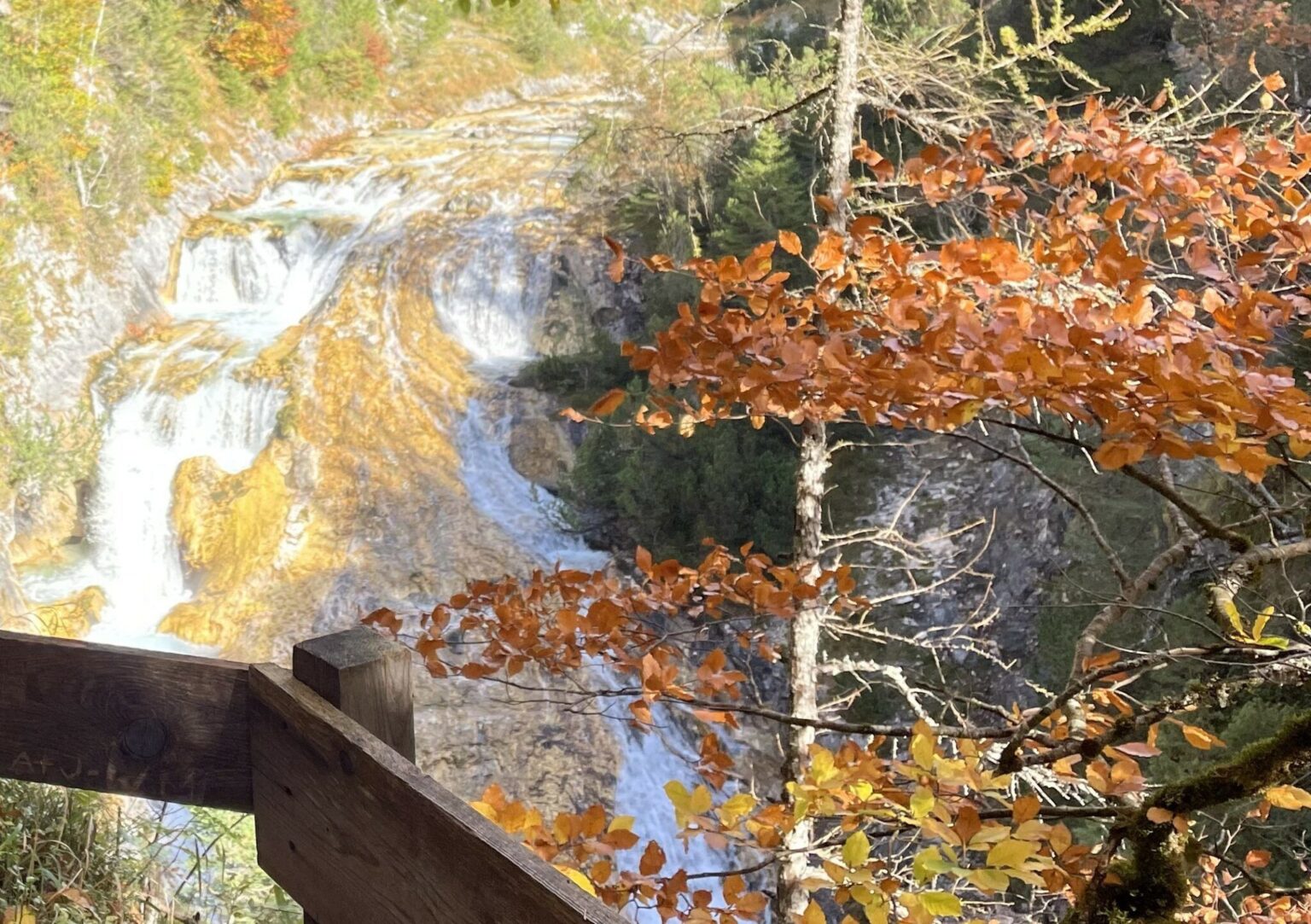 Variante (5.): Die Wanderung auf dem Karwendelklammsteig lässt sich auch verlängern. Würden wir weiter geradeaus ins Karwendeltal gehen, könnten wir nach gut einem Kilometer rechts den Karwendelbach überqueren – dort wo dieser direkt nach einem Wasserfall beginnt sich tief in die Klamm einzugraben. Über eine Forststraße gelangen wir zum Gasthof Wiesenhof, von wo aus wir schließlich einfach die Straße entlang zurück zum Parkplatz Länd spazieren (Gehzeit: +1h).