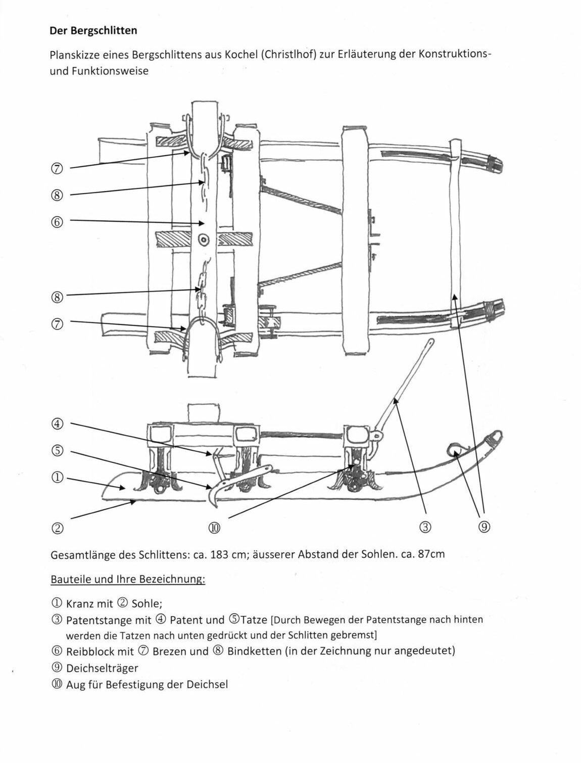 Bei großen Gefälle wurden entweder Scherketten eingehängt, die auf der Höhe des Reibblocks unter den Sohlen des Schlittens schleifen sollten, oder man brachte einen “Umschlag” an, eine Kette, die hinten um die ganze Ladung gelegt wurde.
