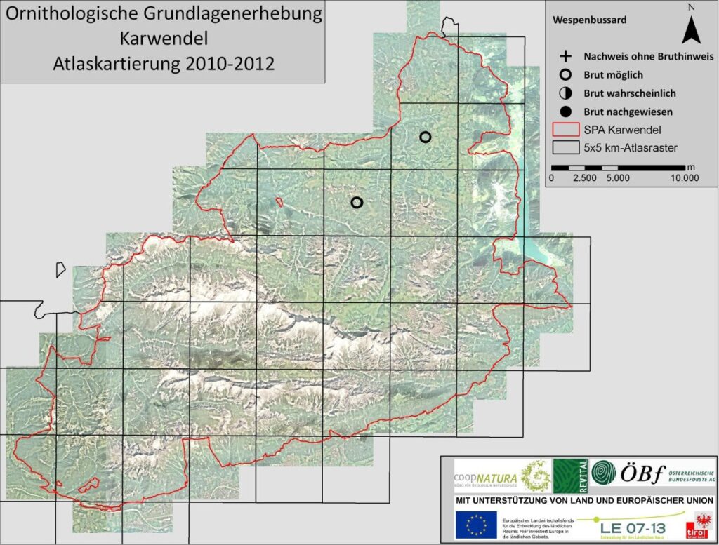Brutzeitvorkommen im Bächen- und Risstal. Nach Literaturangaben und Beobachtungen abseits der Kartierungen dieses Projekts brütet der Wespenbussard auch an den wärmebegünstigten Südhangen zum Inntal zwischen Reith b. Seefeld und Stans.